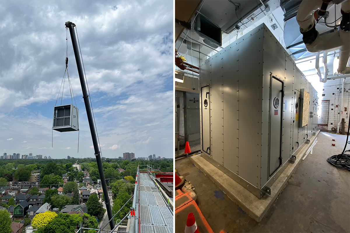 To support this change of programming on the 4th floor, a new Air Handling Unit (AHU) was required. This portion of the project consisted of craning and installing a new AHU into the existing Level 8 Penthouse of the Gilgan Wing. The new AHU is connected to existing services in the Penthouse, including steam, chilled water, drainage, and controls.